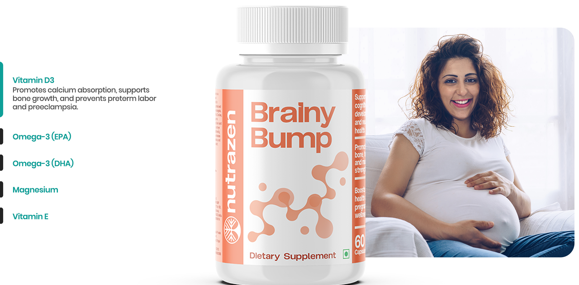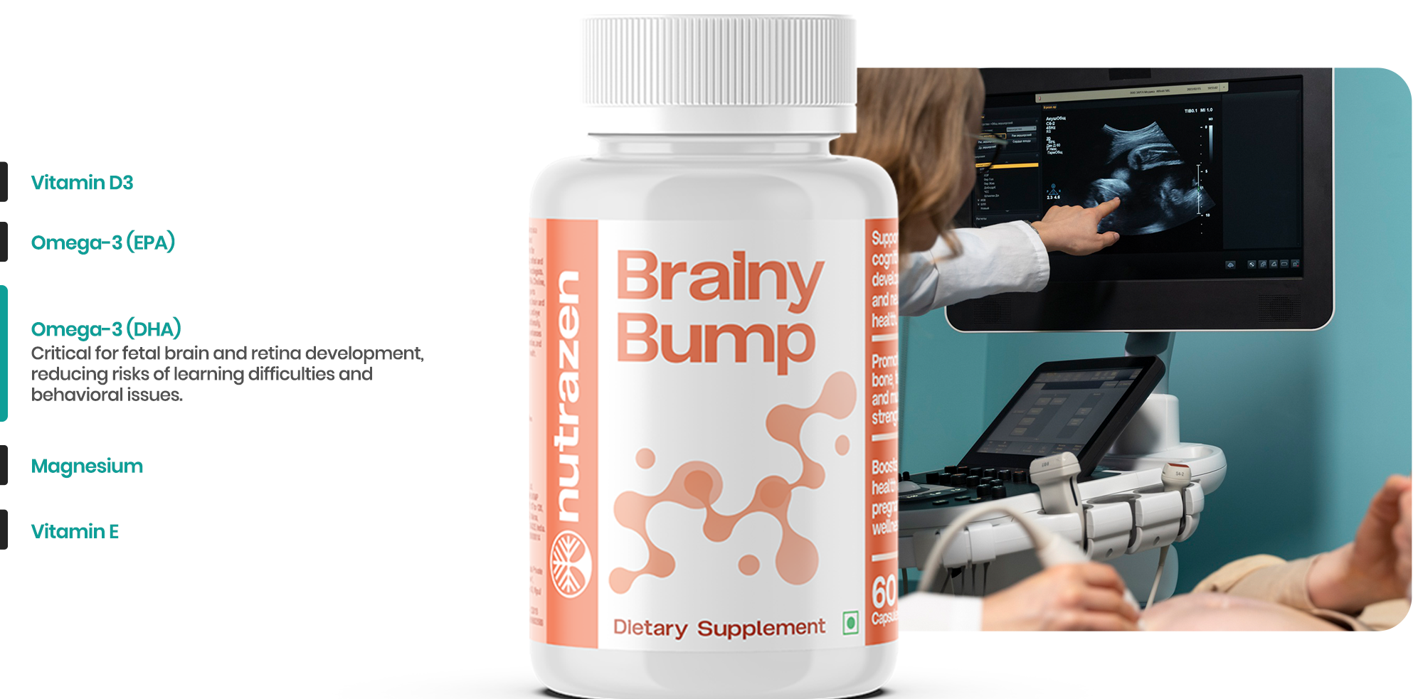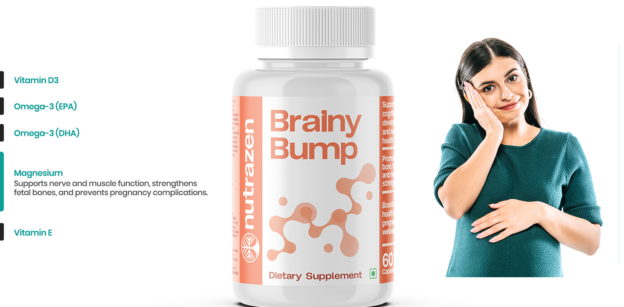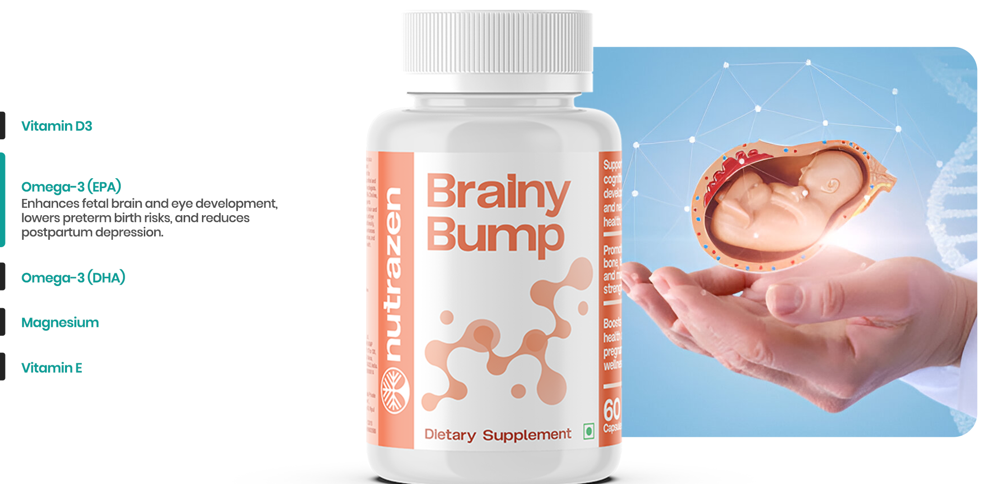 Brainy Bump is a premium prenatal nutraceutical by Nutrazen, formulated with essential nutrients like DHA, EPA, and L-Arginine to support brain, neural, and eye development during pregnancy.