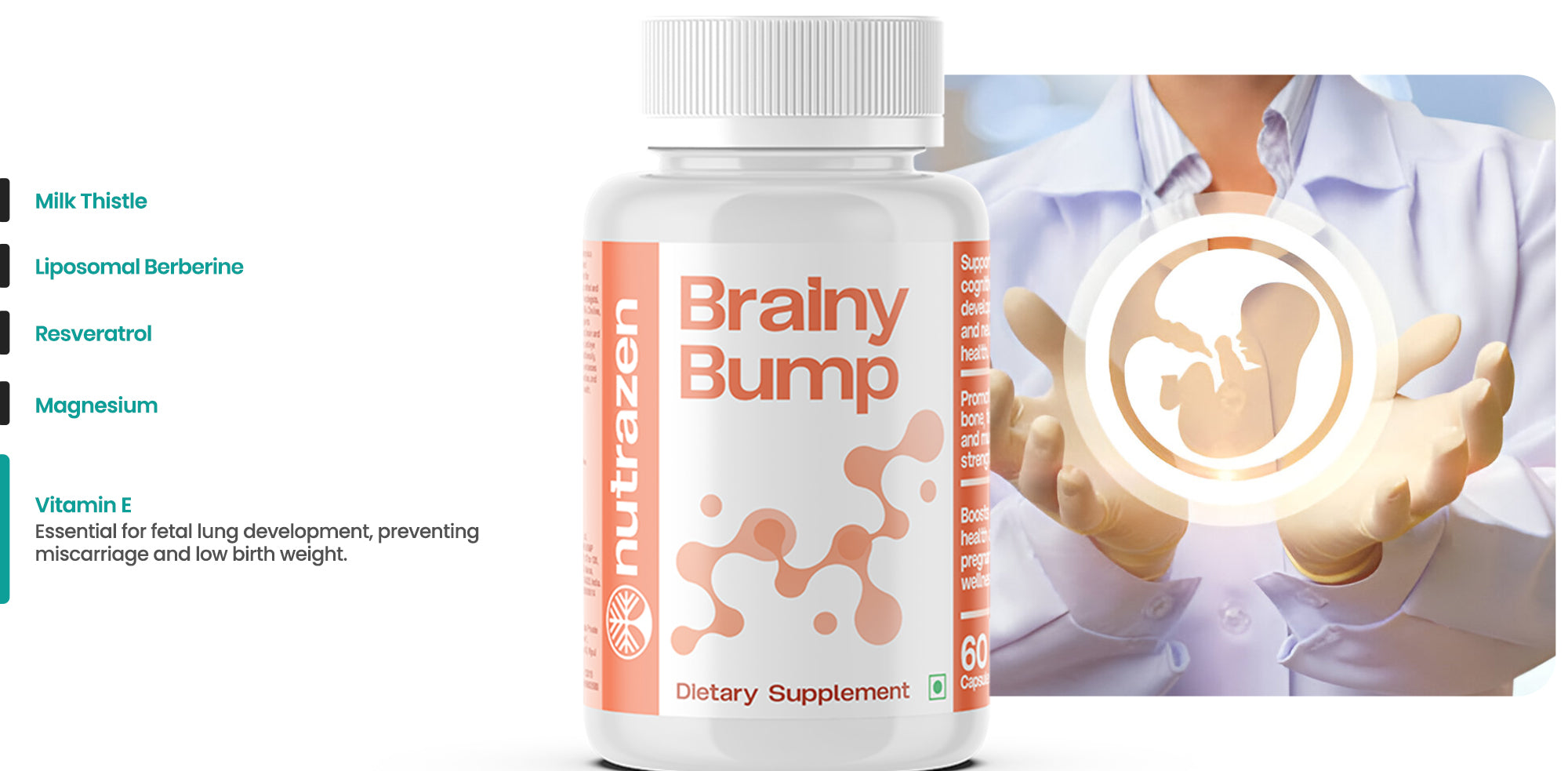 Brainy Bump contains DHA, EPA, and Choline, which are crucial for cognitive abilities, brain formation, and neural tube development in the baby.