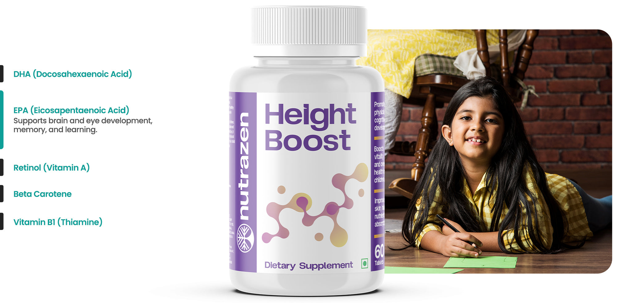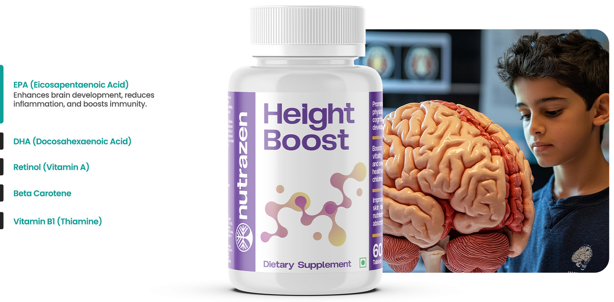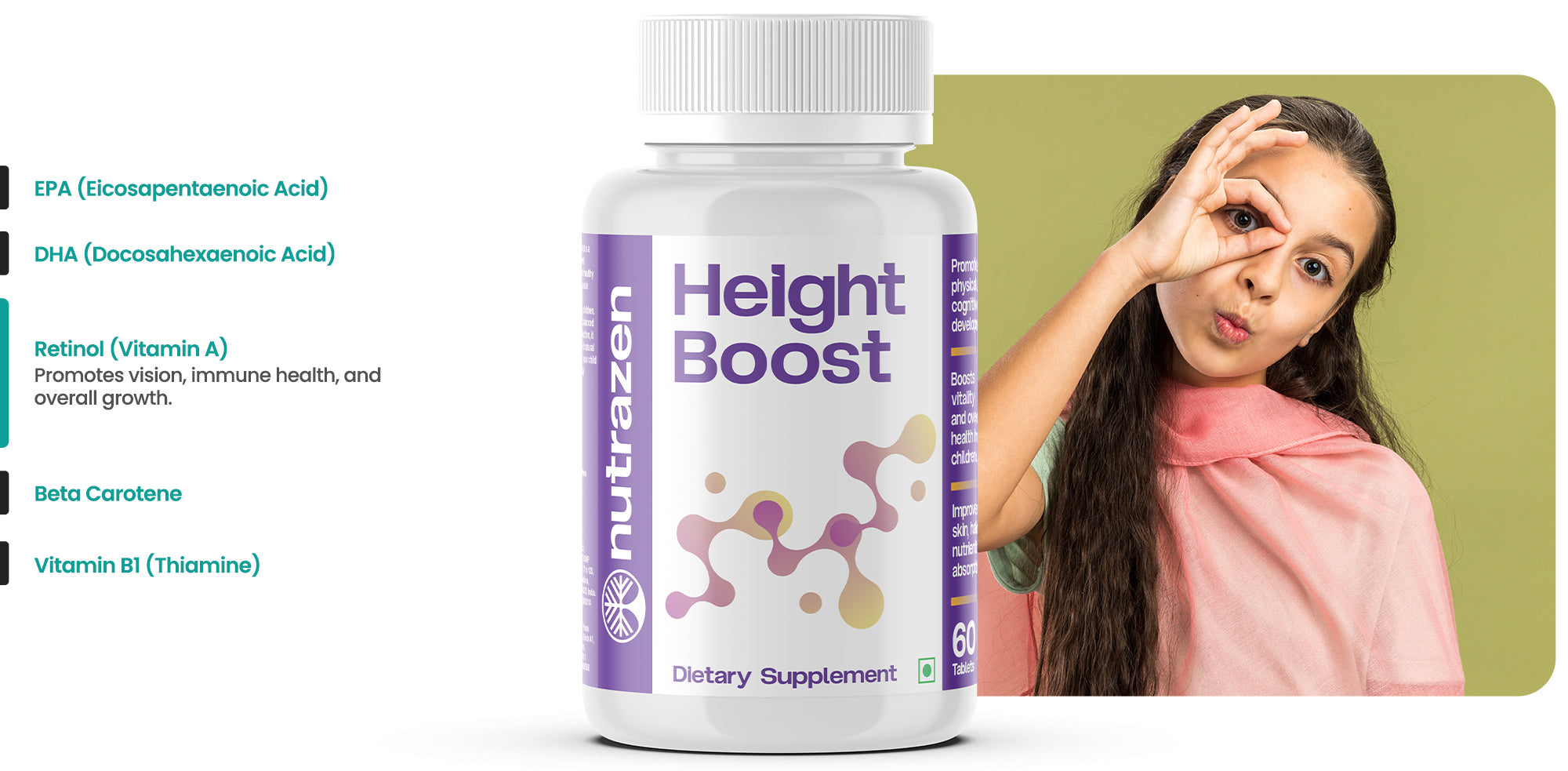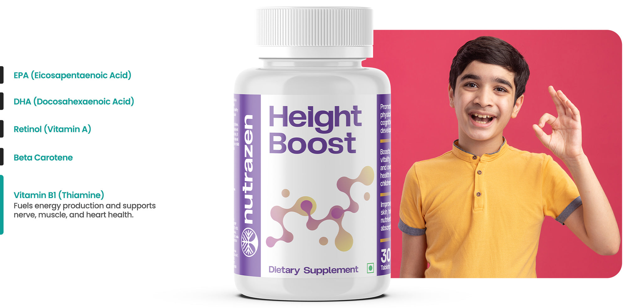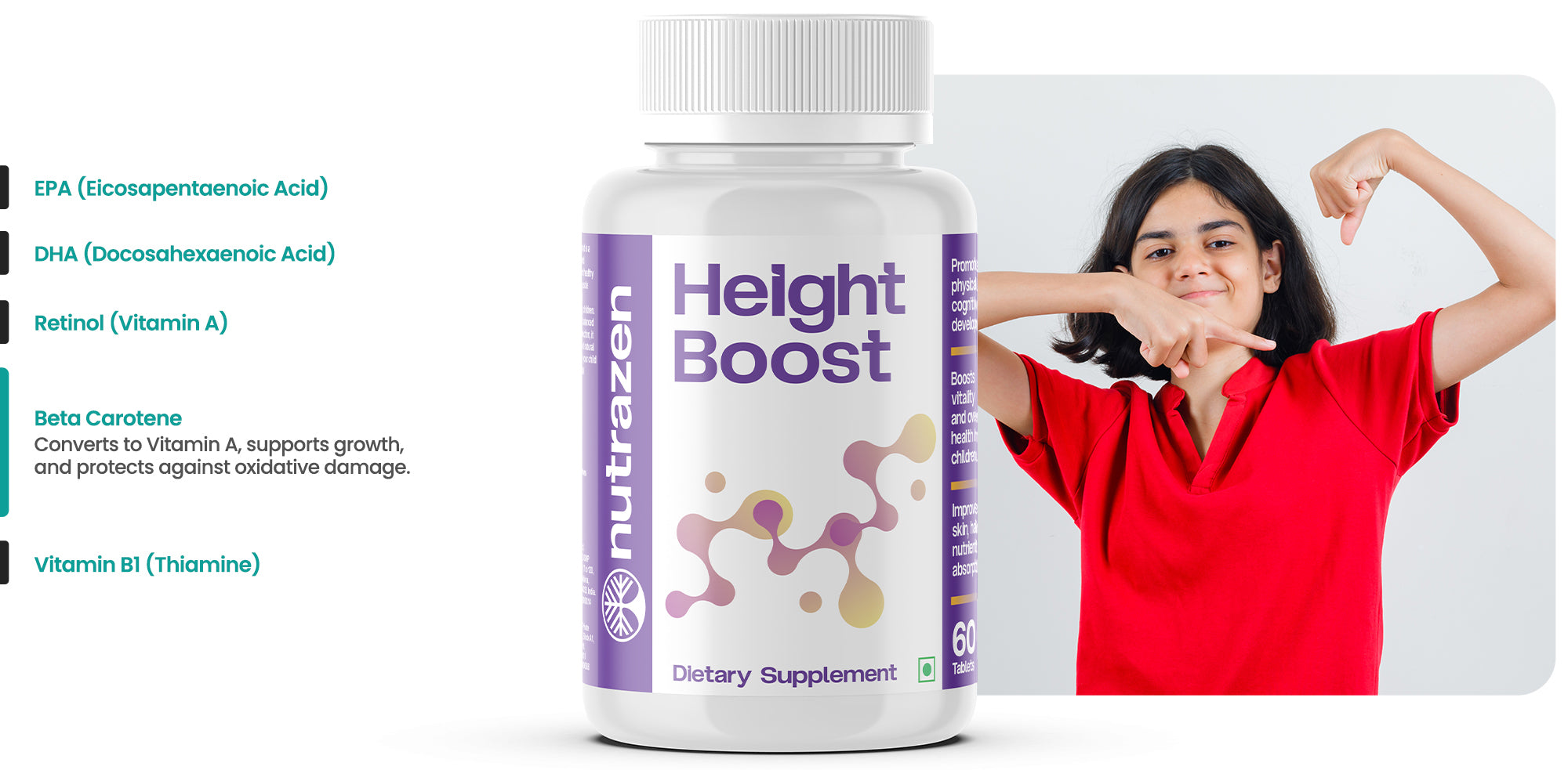 Nutrazen's Height Boost is a scientifically formulated supplement to support healthy bone development, muscle strength, and nutrient absorption in growing children. Designed to promote balanced growth hormone production, it encourages steady and natural physical growth. Help your child reach their full potential and Live Limitless.