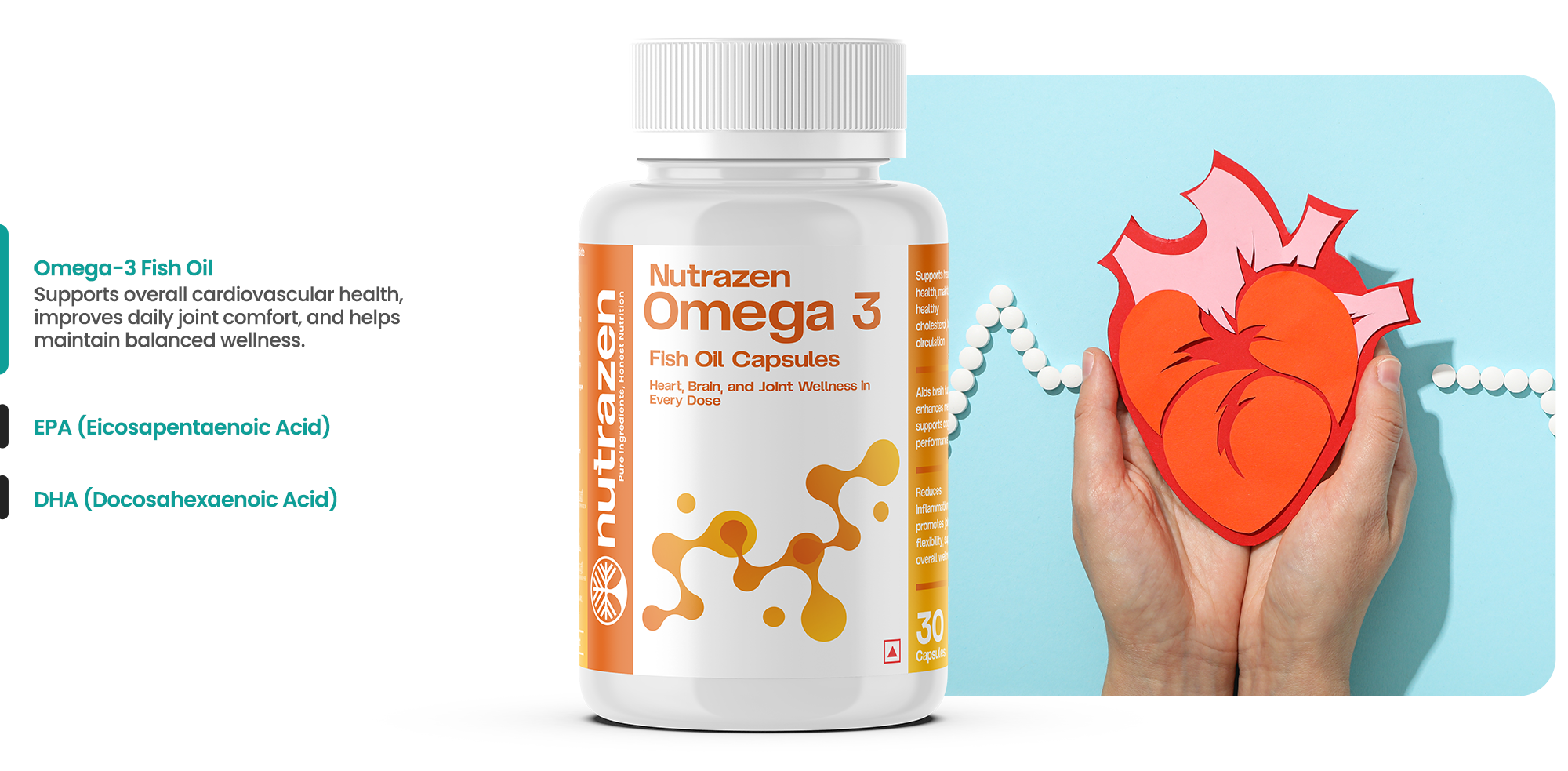 Nutrazen Omega-3 is a premium fish-oil supplement formulated to support heart, brain, and joint wellness with EPA and DHA for daily vitality and long-term health benefits.