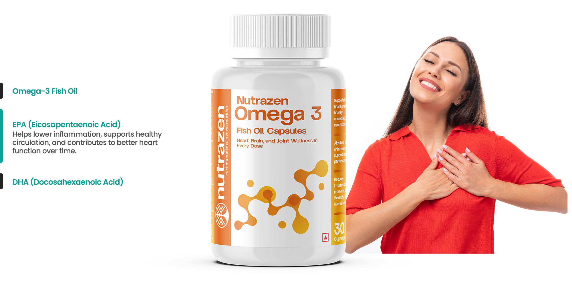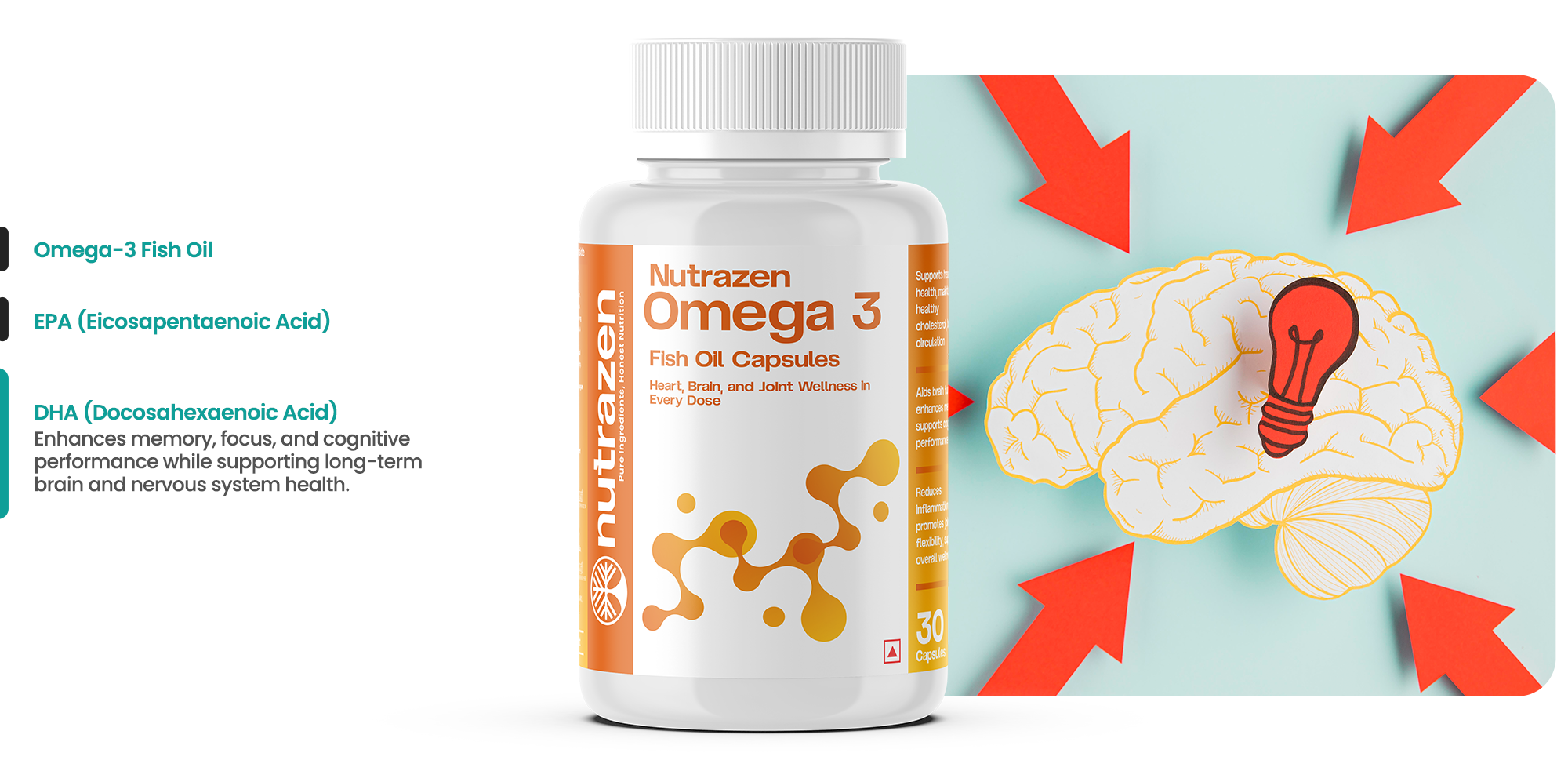Nutrazen Omega-3 delivers premium fish-oil support for heart health, brain function, and joint mobility. With EPA and DHA for circulation, memory, and inflammation control, this clean, no-nonsense formula strengthens your body’s core wellness systems—enabling sustained performance, day-to-day agility, and long-term vitality.