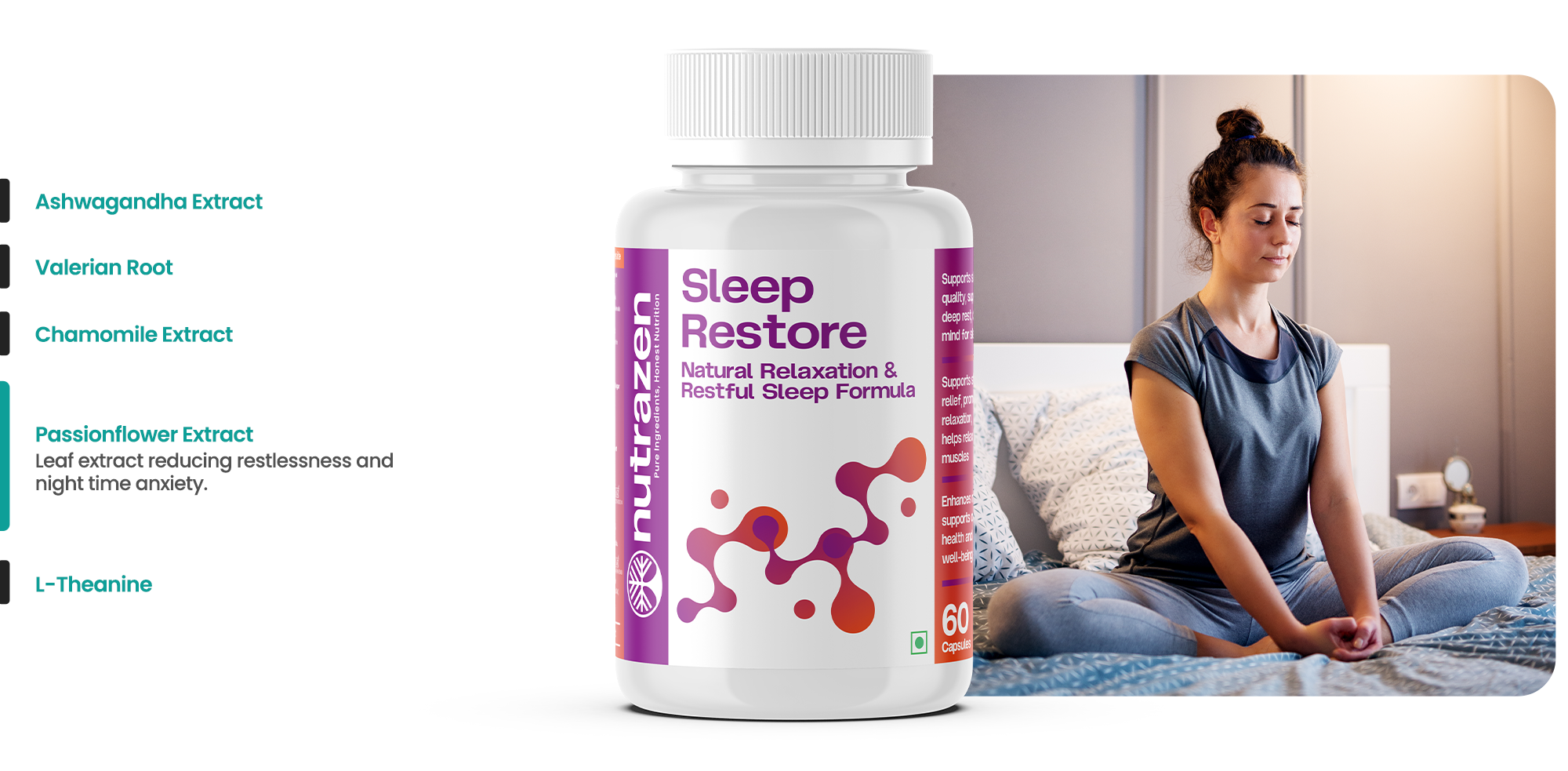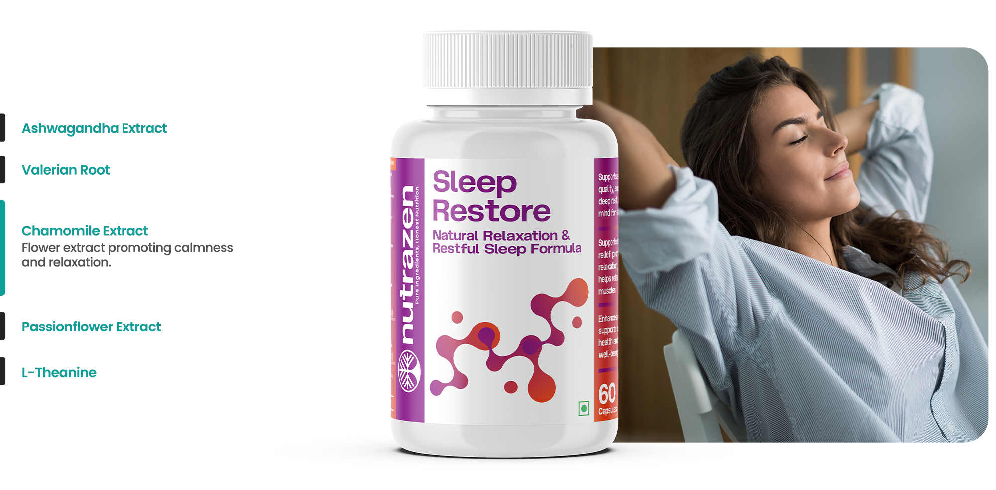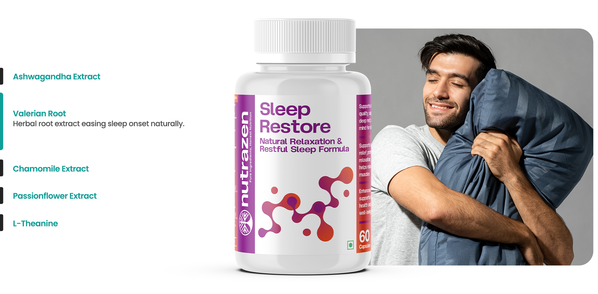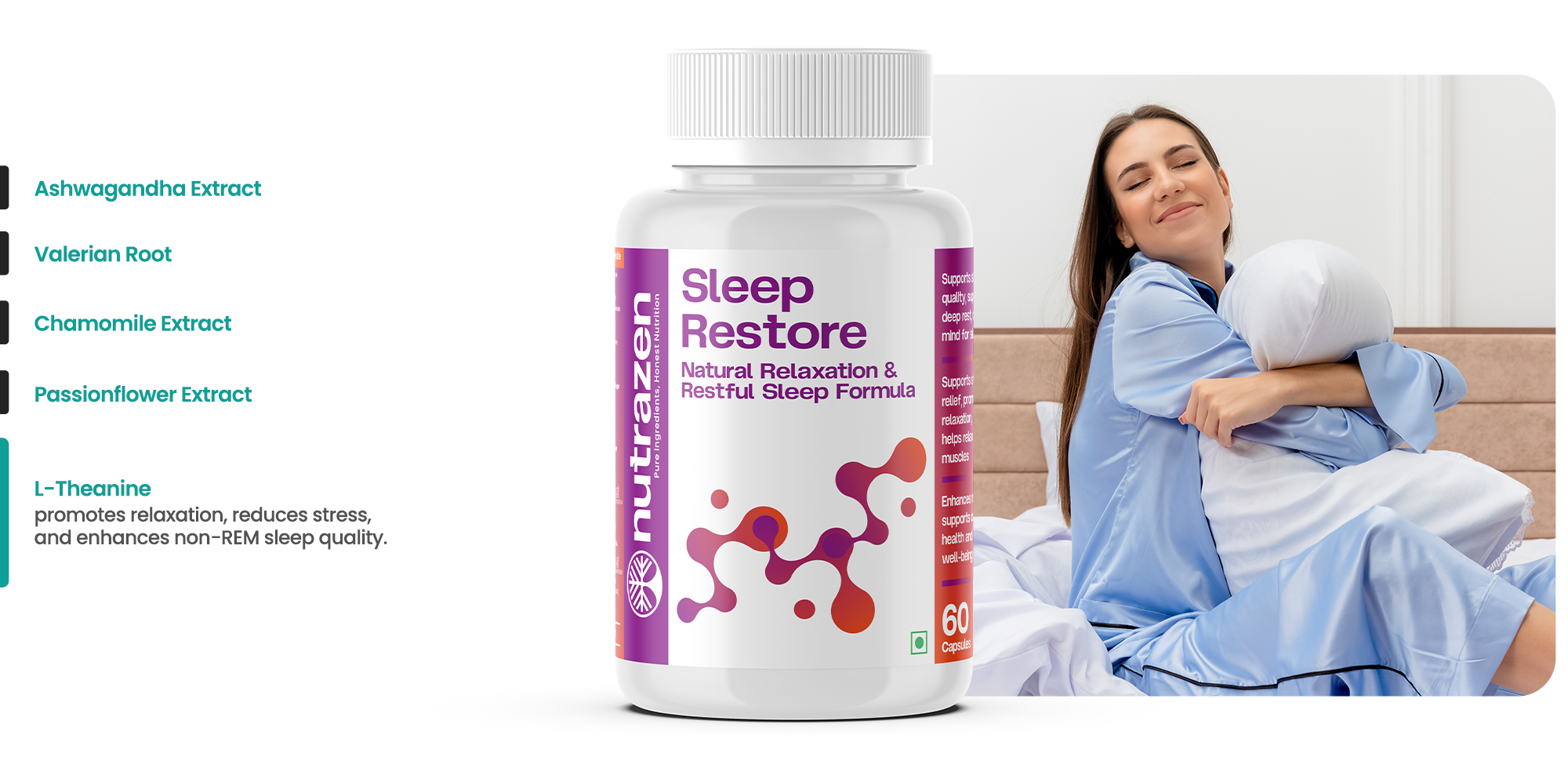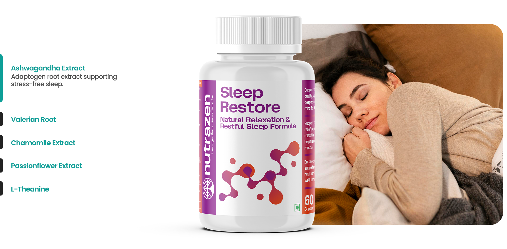 Nutrazen Sleep Restore is a premium blend of magnesium complexes, calming botanicals, and amino acids designed to support deep, restorative sleep. With Ashwagandha, Valerian, and L-Theanine, it helps ease stress, relax the mind, and promote natural sleep cycles—so you wake up refreshed and energized.